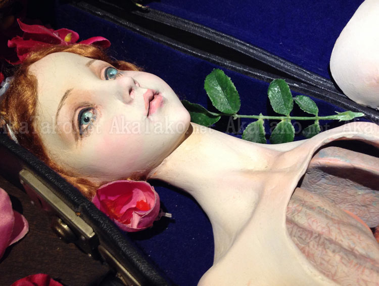 Original, handmade doll by Mari Shimizu of a sweet girl with no arms or legs. She comes in a violin case and has a removable chest piece to reveal her internal organs (some of which are removable).