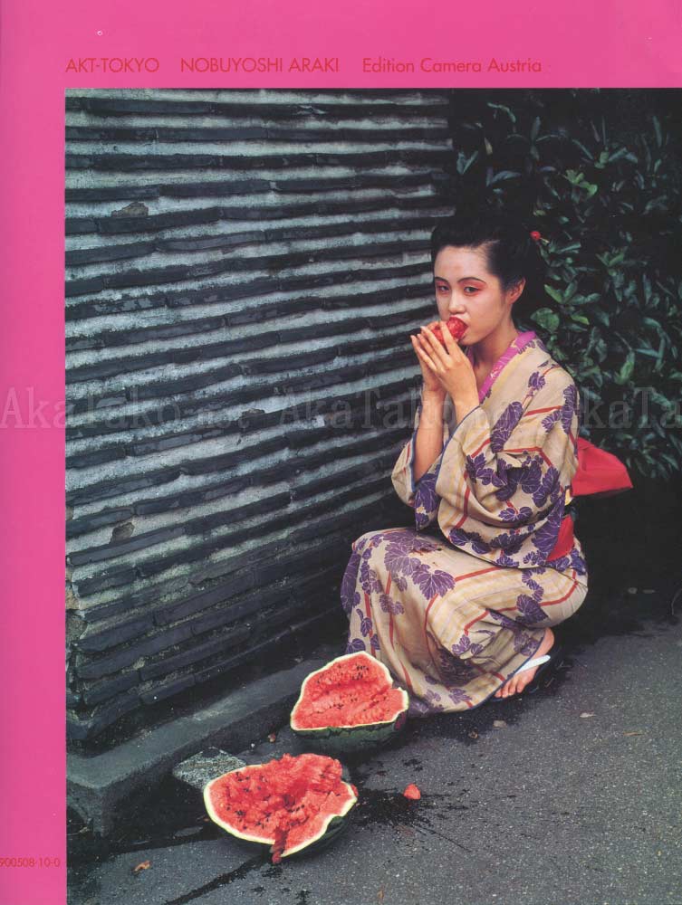 Oversized book of photographs by Nobuyoshi Araki from 1971-1991. Mostly black and white with a few color at the end. Starts with photos of his wife and includes a (print of a) hand written note by Araki about her death - translated near end of book. Other photos of Tokyo life and women, sex, kinbaku, and nudity. Bilingual essays (German/English) by Toshiharu Ito, Hiromi Ito, Taeko Tomioka, biographical notes, exhibitions, and monographic books.