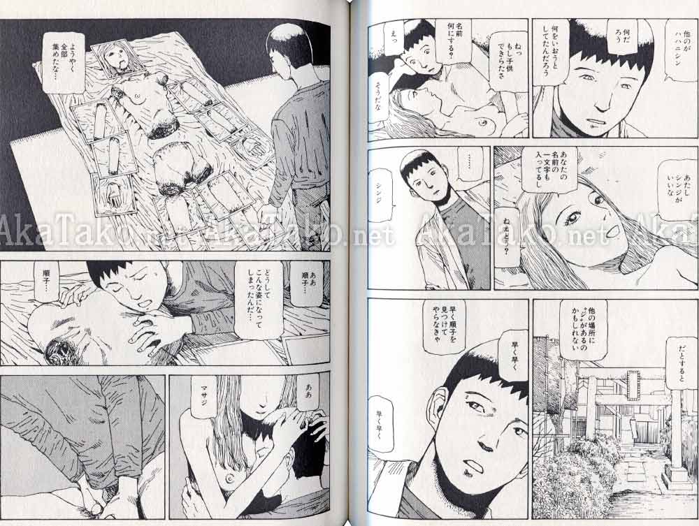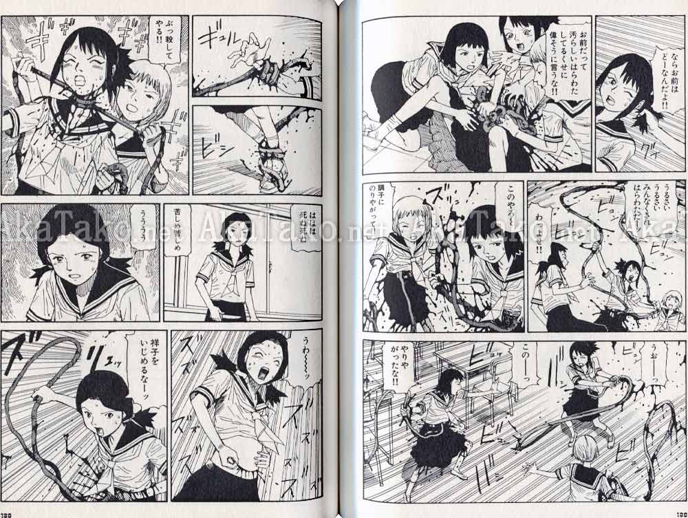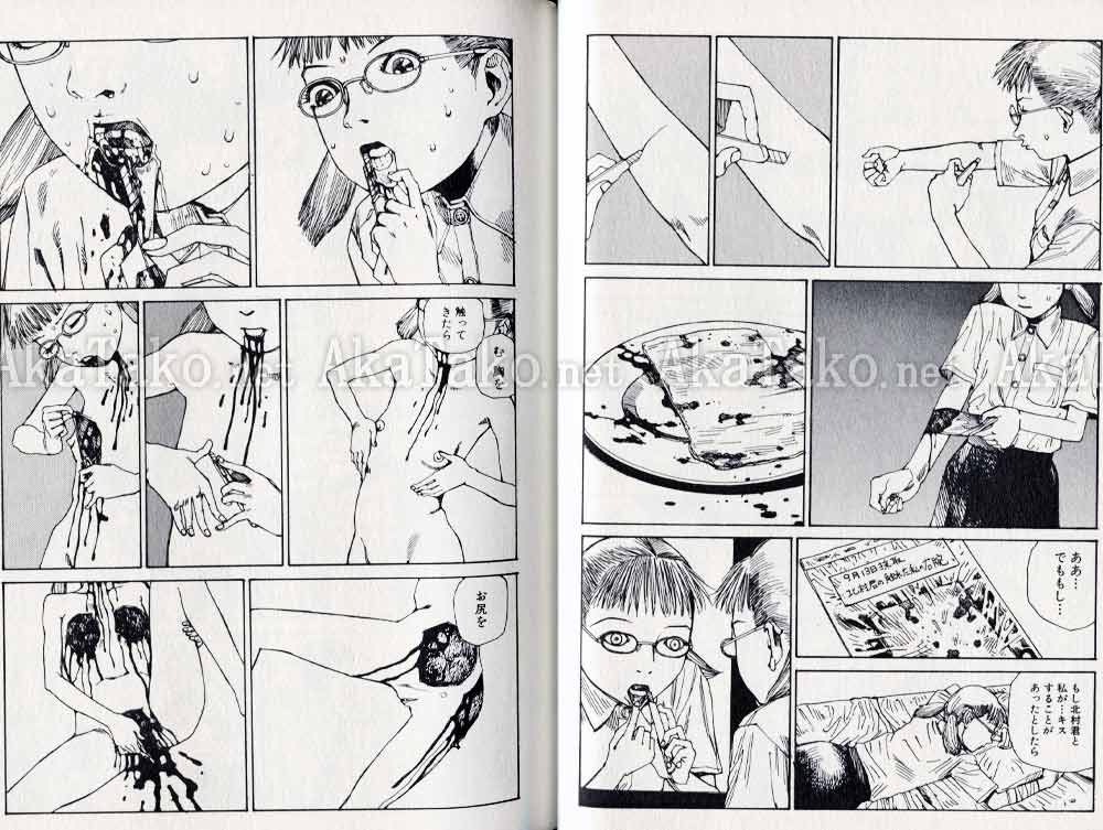 Manga of nine short stories with a lot of school girl violence, some sex, an entire album of (drawn) fellatio snapshots, many pages of seppuku/harakiri, etc. UNSIGNED copy. First page is red and white, remaining pages are black and white.