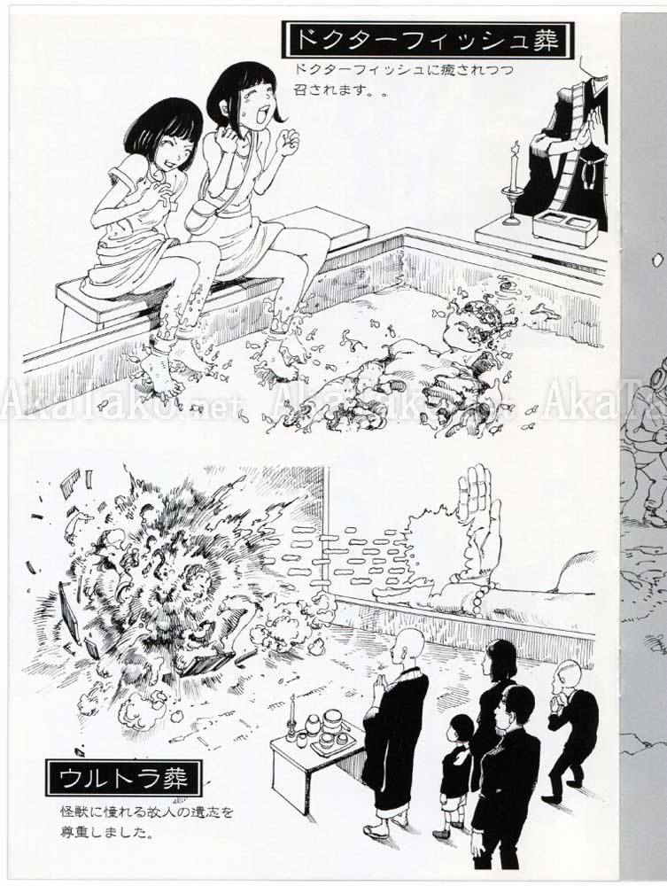 Volume 2 of bizarre alternative ideas to traditional Japanese funeral rites. Cremation is boring! Why not try kebab, mochi pounding, doctor fish, Kamehameha Wave, or even a simple explosion to get rid of the body?