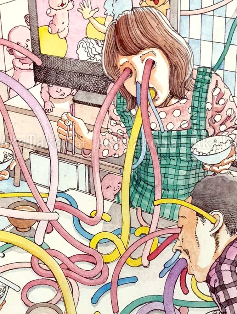 Brand new Shintaro Kago poster exclusive to AkaTako. A family spends some quality time together at the dinner table. Things get a little bit crazy with colorful worm-like streamers ejecting from orifices.