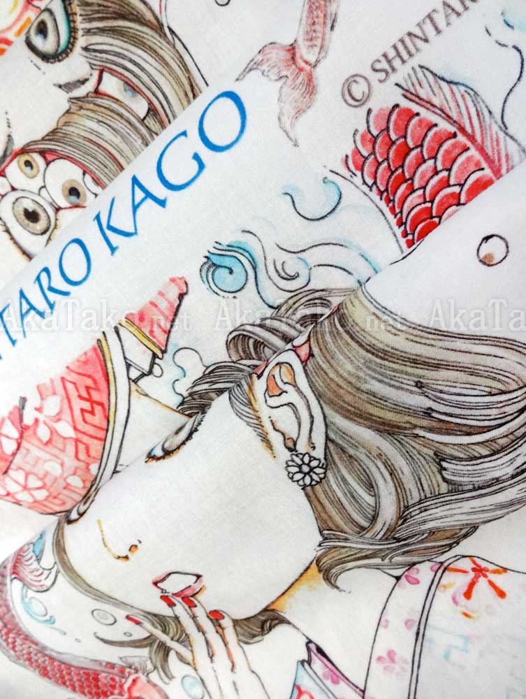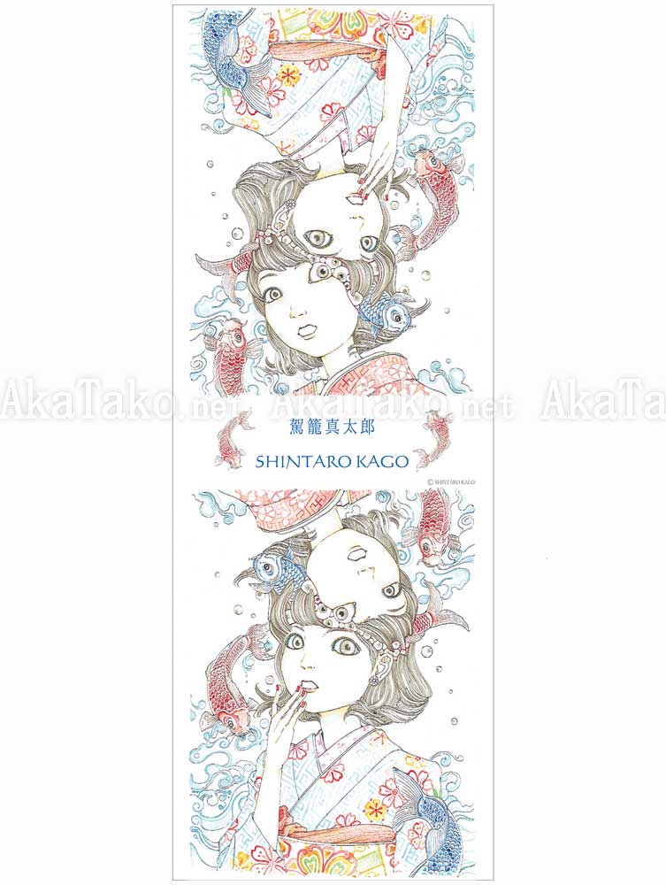 Lightweight cotton tenugui featuring Shintaro Kago's koi fish and kimono wearing funny girl with a double head full of far too many eyeballs. The design is mirrored from top to bottom with his name in the center.