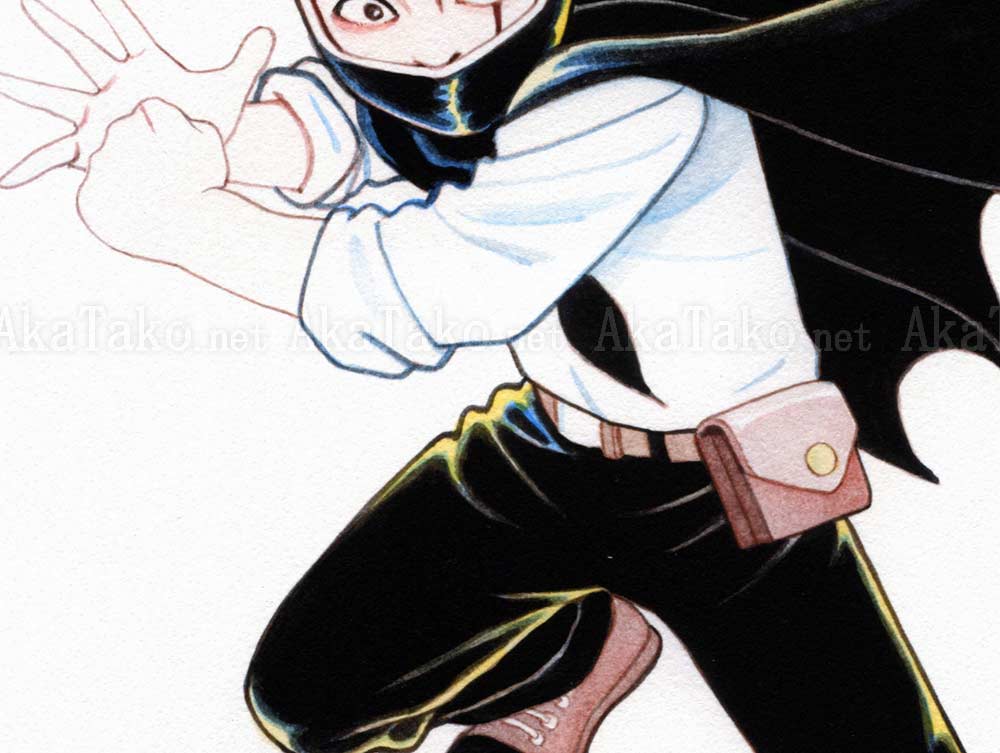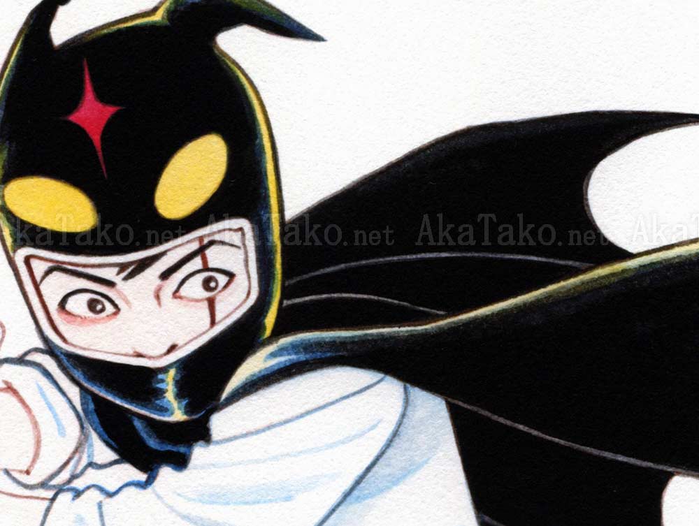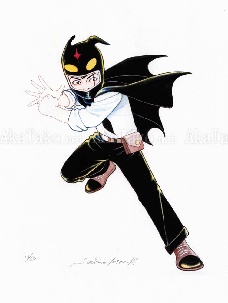 Giclée print of an illustration by Suehiro Maruo called "Huma no Kojirou" or "The Prize of Immortality". A young boy in black pants and a white shirt wears a black cape and mask. There is a scar across his left eye and he looks like he's ready for action! Background is a very very pale blue/gray.
