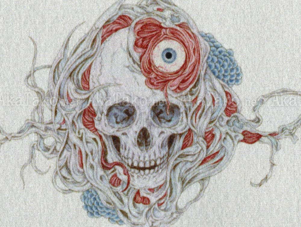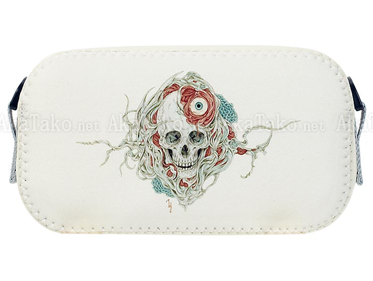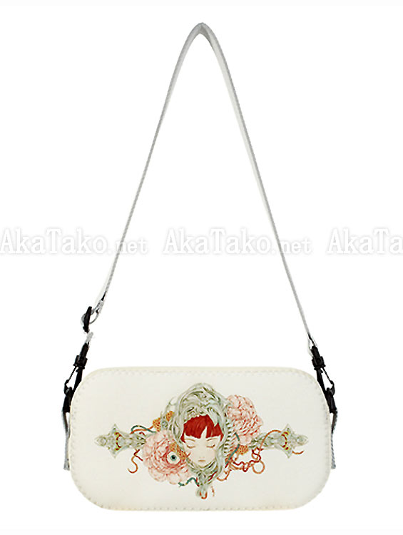 Handmade bag features the Takato Yamamoto's "Eyeball Bug and Roses" artwork. A pale face with red hair is surrounded by organic bone shapes and pink roses. The reverse shows a smiling skull with an ogling eyeball. Pale gray background.