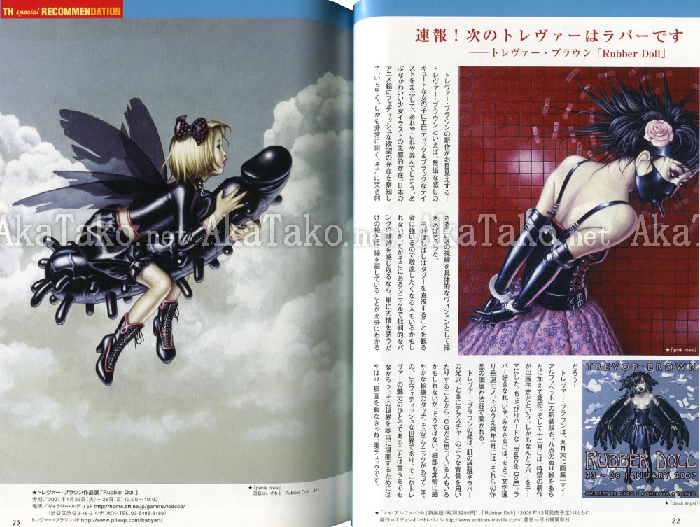 Japanese language art magazine themed on "Child's Paradise" (分身パラダイス) with a strong focus on twins & soul mates. Quite a few full color pages with the bulk of the magazine in black & white, purple & white, or blue & white. Two page article on Trevor Brown's January 2007 exhibition for Rubber Doll in Shibuya, Tokyo. Text is completely in Japanese.