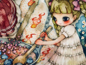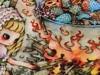 Mini poster print with the artwork "Lunch Is Ready" by Tama. A red headed girl is tied over a bubbling cauldron of stew. Five girls in ruffled lace dresses make preparations for lunch - stoking the fire, stirring the pot, and bringing the knives.