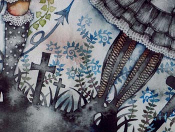Mini poster print with the artwork "Negaholic" by Tama. Three girls dressed in frilly black and white dresses with lace trim hold hands. There are many black crosses at their feet and the air swirls behind them. The center girl has bat wings and a pointed tail.