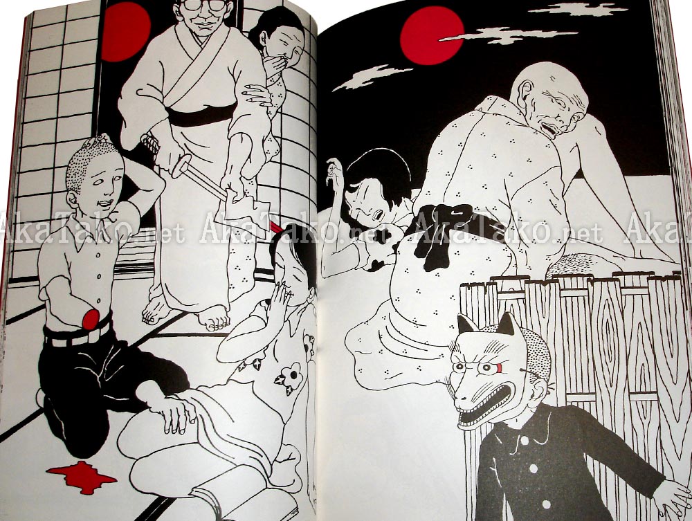 Large format softcover book by Toshio Saeki features a collection of his S&M inspired works printed in black, white and red. Comes in a cardboard sleeve. I'm not sure about the translation of the title - could be "Prison Omission Works" or "Prison Works"? Only two pages of text (in Japanese) and every single other page is an eroguro print.