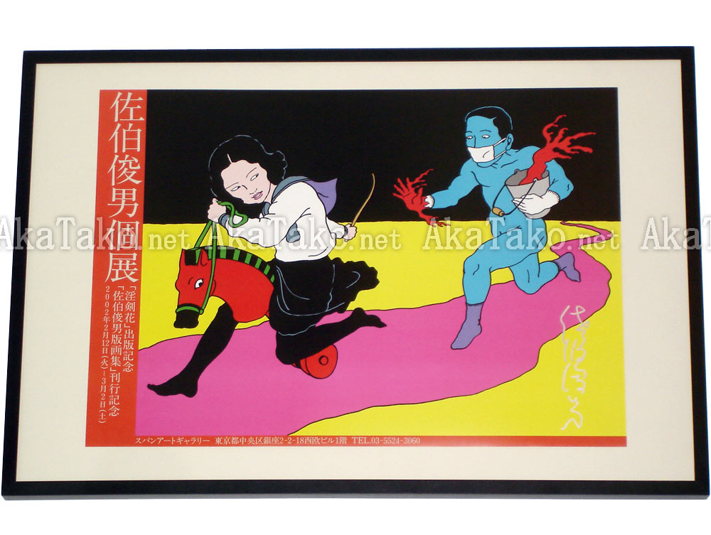 This Toshio Saeki poster features a Japanese schoolgirl riding a hobbyhorse and being chased by a blue man wearing only purple socks and carrying a bucket of blood. He's wearing white gloves but one of them is bloody. He's also wearing a surgical mask.
