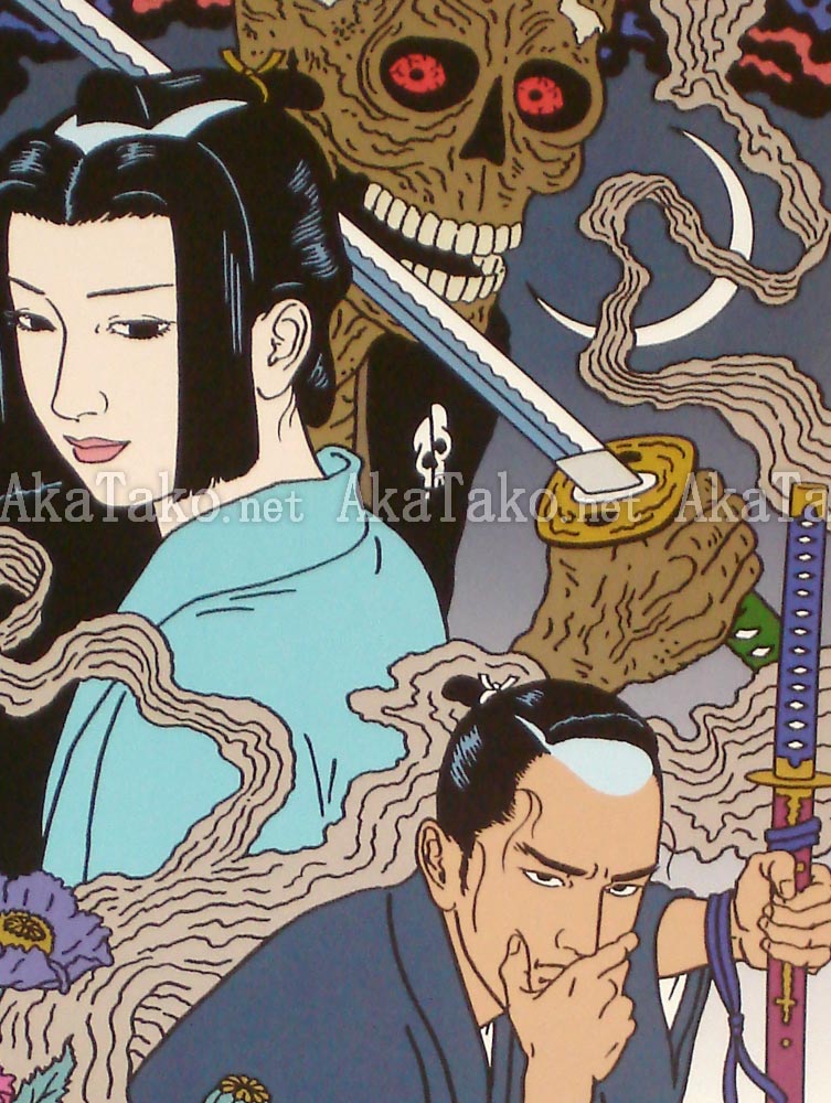 This Toshio Saeki poster features a Japanese woman with a traditional samurai hair cut, a samurai man holding a sword, swirls of mist and smoke, a thin crescent moon, poppy flowers, and a skeletal figure with glowing red eyes looming in the background.