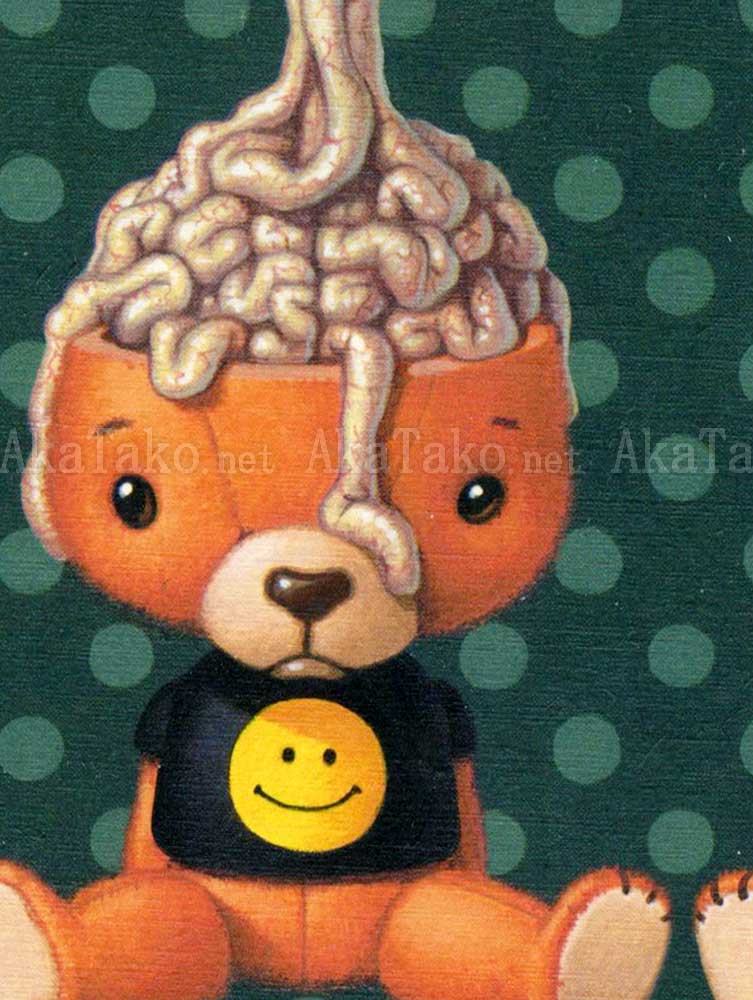 Original painting "Brains" is part of the "Toy Box" series by Trevor Brown. The postcard version contains this rhyme: "fill my empty head / with all i need to know / to see me through a happy life / why did he get more than me though!?".