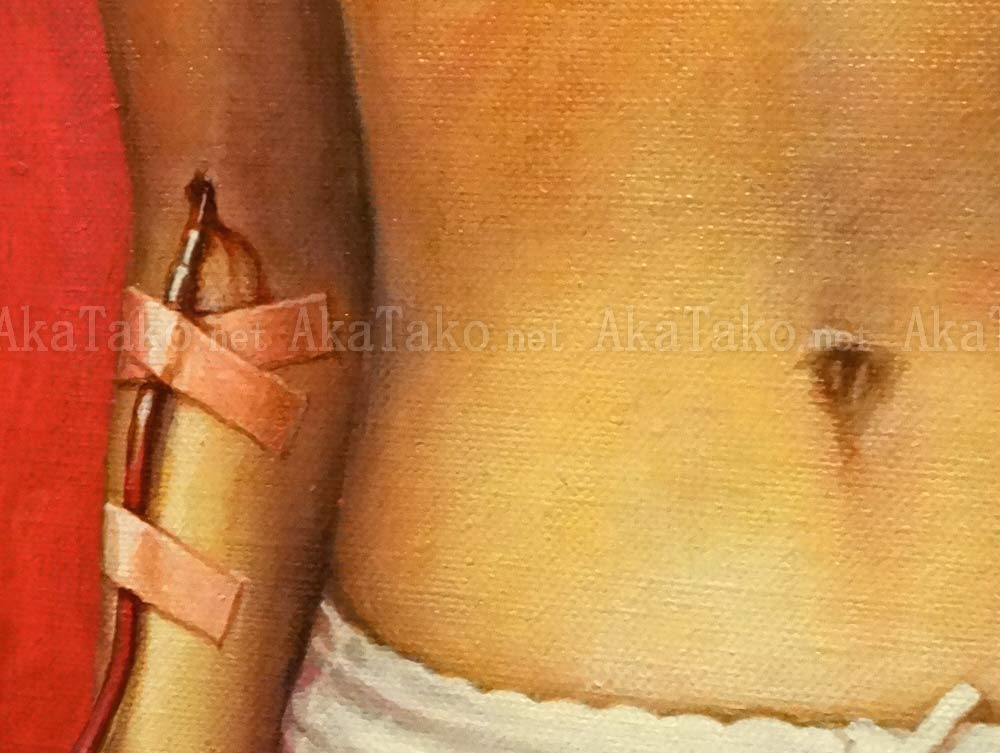 Original painting "Pink Transfusion" was first published in Trevor Brown's Medical Fun book. An Asian girl in white panties stands in front of a dark pink wall. She eyes a hanging IV bag full of blood which curls up and into her left arm. A second tube comes out of her right arm and disappears off the edge of the canvas.