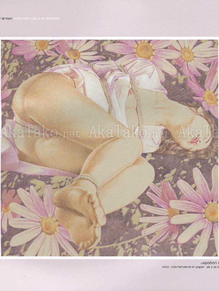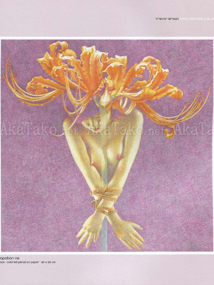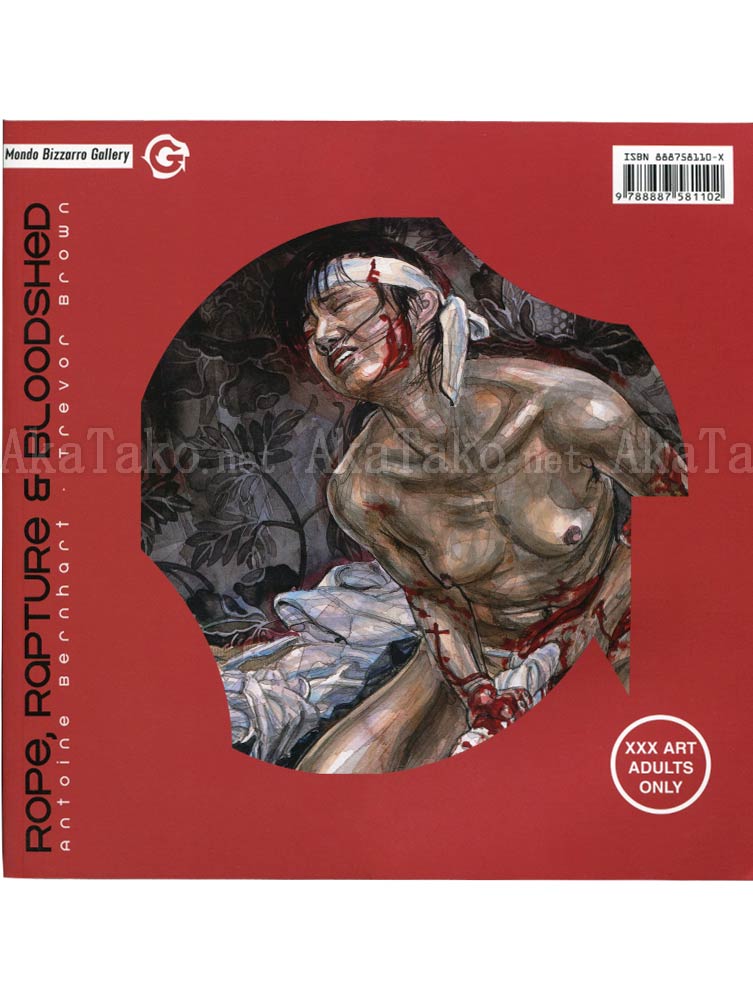 Softcover book of works - first half of book is kinbaku drawings by Trevor Brown. 16 plates from the "Japabon" series. All very soft pastel colors created by colored pencil on paper. Flip the book over for a new cover and works by Antoine Bernhart (Bloodshed). 29 plates of graphic and visceral (literally) images.