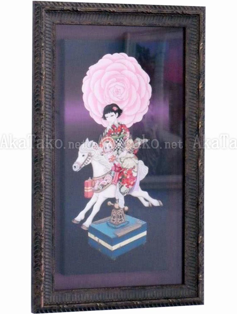 Original painting "Otome-Tsubaki" (Little Girl Camellia) by Yuji Moriguchi. A beautiful young Japanese girl rides a wooden horse side-saddle and holds her pretty doll tight. Her extravagantly colored kimono contrasts with the simple beauty of an oversized pink camellia in the background.