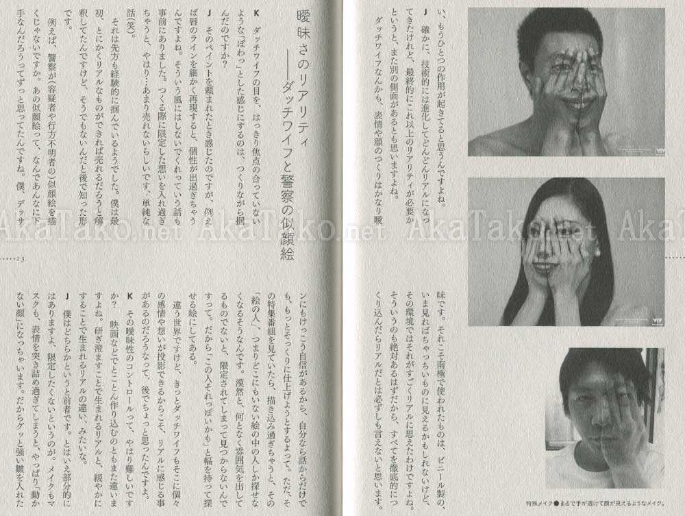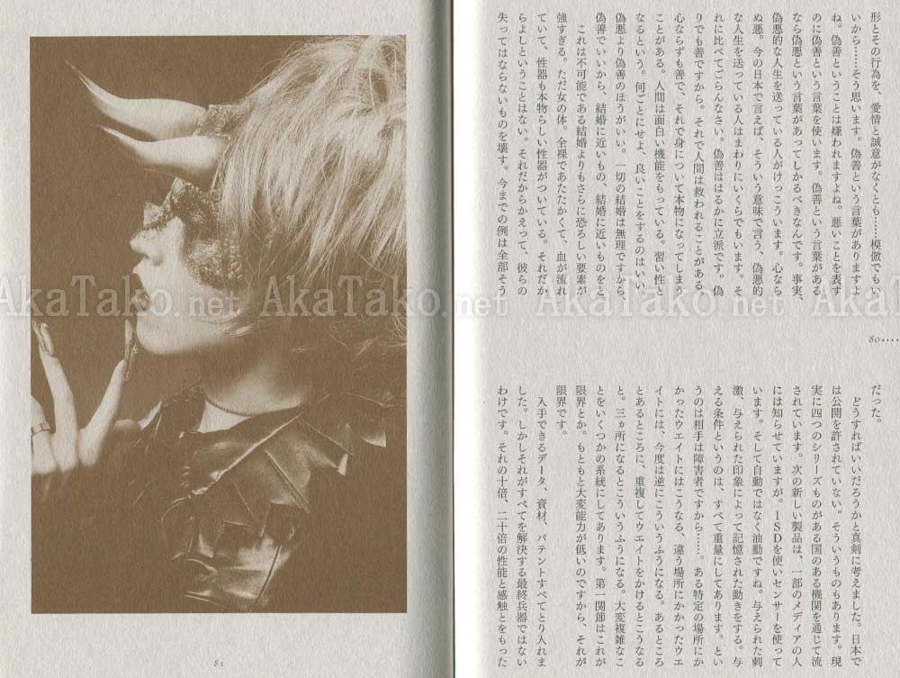 Book is monochromatic with black or sepia tones. In addition to the regular pages, there are four quadruple length fold outs to better show his makeup effects. Text is 100% Japanese.