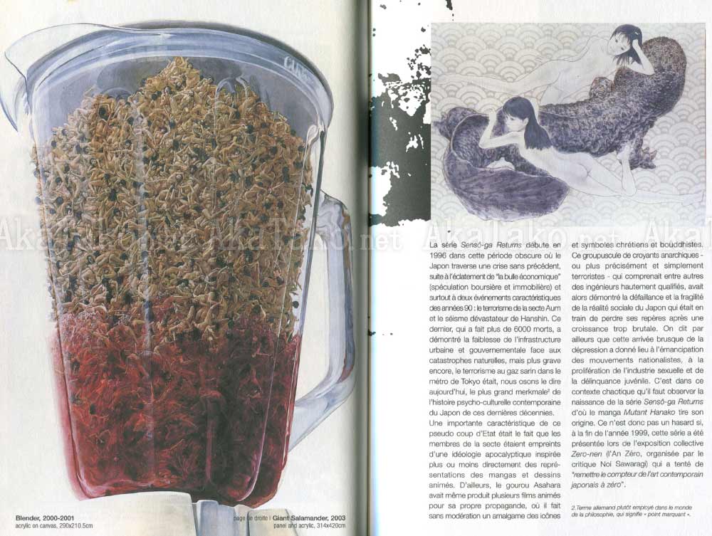 Sixty pages of the comic "Mutant Hanako" and an additional twenty-four pages full color images of paintings, photos, sculptures, etc. by Makoto Aida. Includes text by Dominick Chen and a postface by Makoto Aida. All text is French.